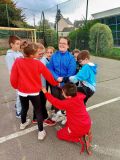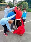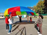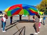 On joue au jeu du parachute et au jeu de la ronde emmêlée.